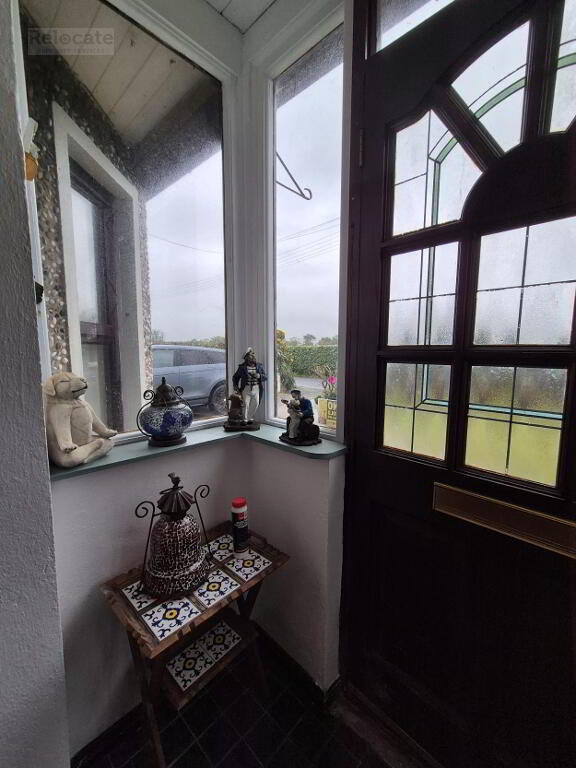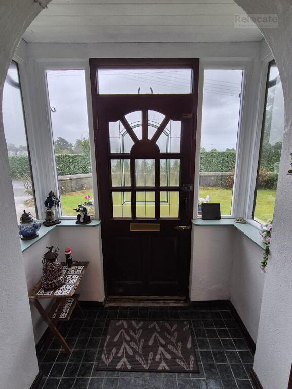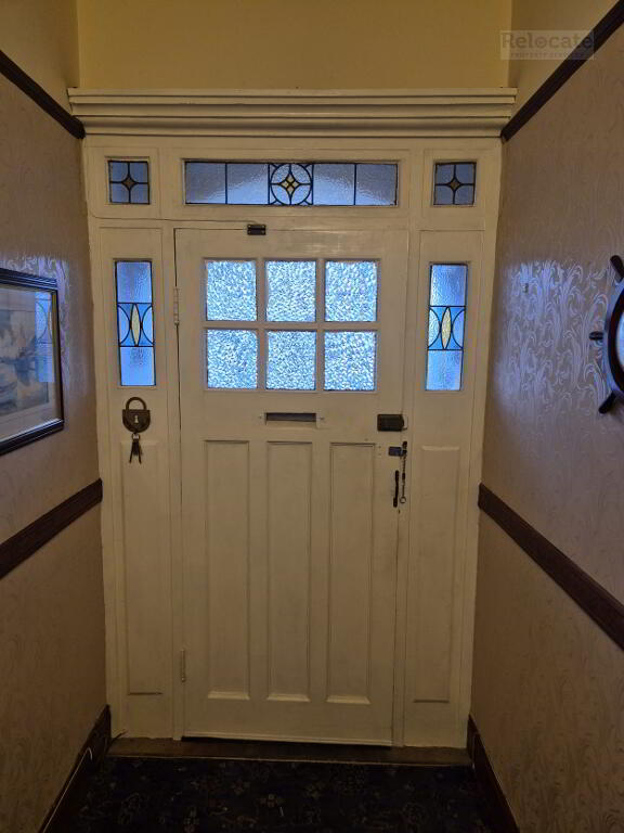 Hard wood front door with stained glass and glazed side panels. Tiled floor. Arch ceiling and hard wood inner door with stained glass surround.