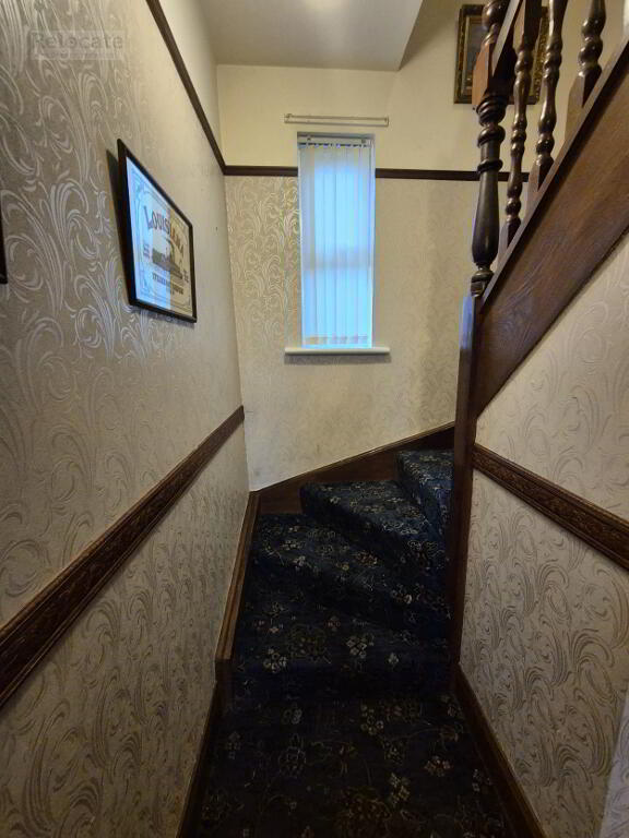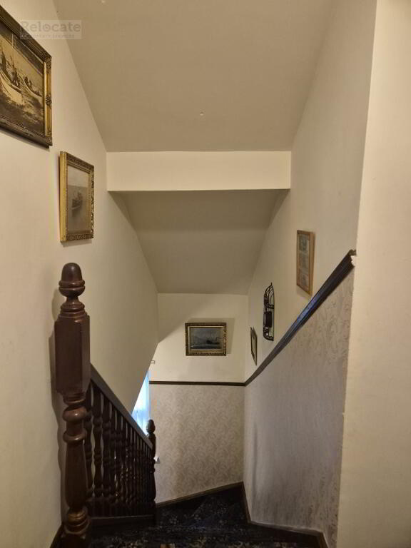 Carpeted stairs with solid wood balustrade. Under stairs storage cupboard. Window on stairs. Picture rail.