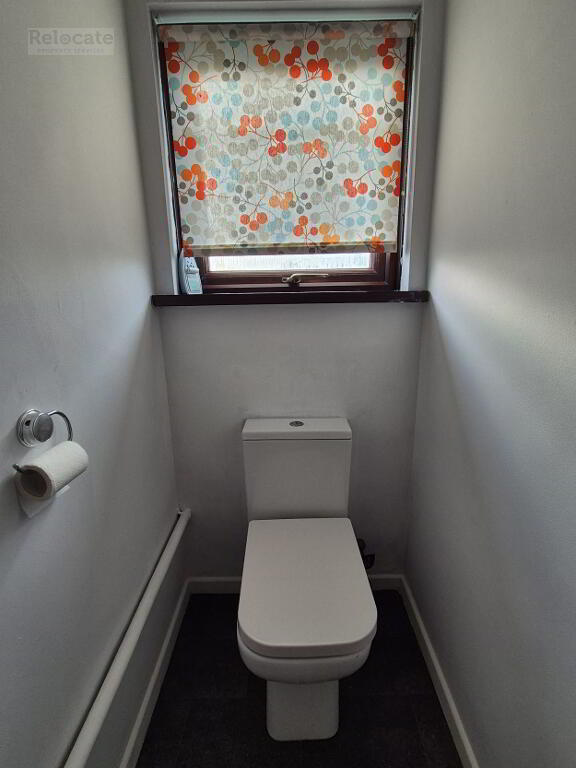 WC and wash hand basin. Storage unit. Tiled at splash back. Vinyl flooring. Privacy window to side. Roller blind.