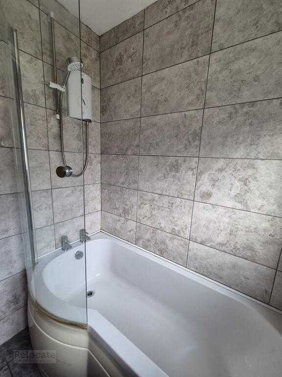 Fitted suite comprising WC, wash hand basin and curved bath fitted with Mira electric shower. Curved shower screen. Fitted storage unit under sink. Fully tiled walls. Tiled flooring. Extractor fan. Privacy window to rear.