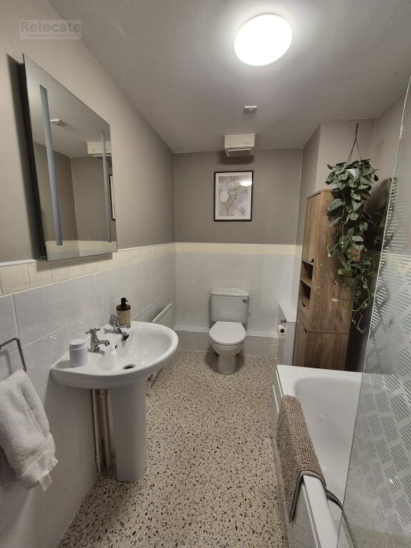 Terrazzo style vinyl flooring. White bathroom suite with shower over bath. Chrome fittings. Shower screen. Part tiled walls and fully tiled around bath/shower. Extractor fan. Wall mounted touch mirror light. Radiator. Ceiling light.