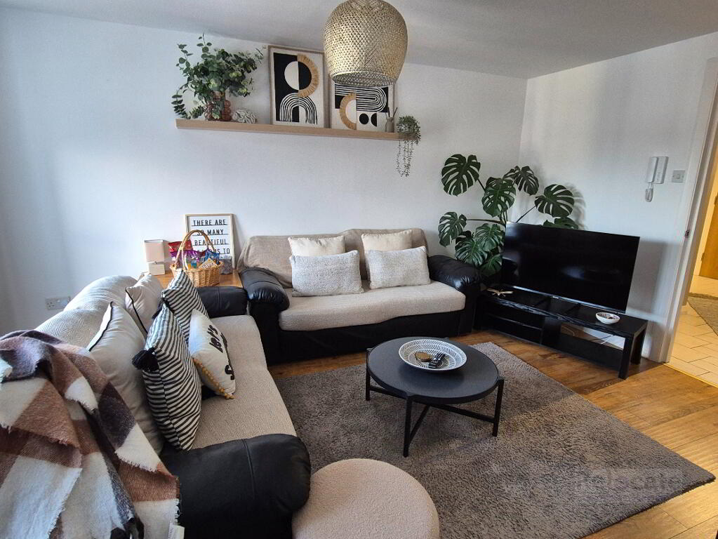 Grey shaker style kitchen with high and low level units. Integrated Fridge/Freezer. Electric Whirlpool oven and 4 ring hob with integrated extractor fan. Laminate worktops with tiled splashback. Stainless steel sink & drainer. Tiled floor to kitchen area. Smoke alarm. Ceiling light x2. Laminate wood flooring to dining and living areas. Painted walls. 2 double radiators. 2 front aspect windows fitted with louvre blinds. 5 double socket power points. Tv point. Phone point. Phone entry access from main building door.