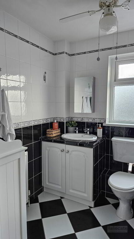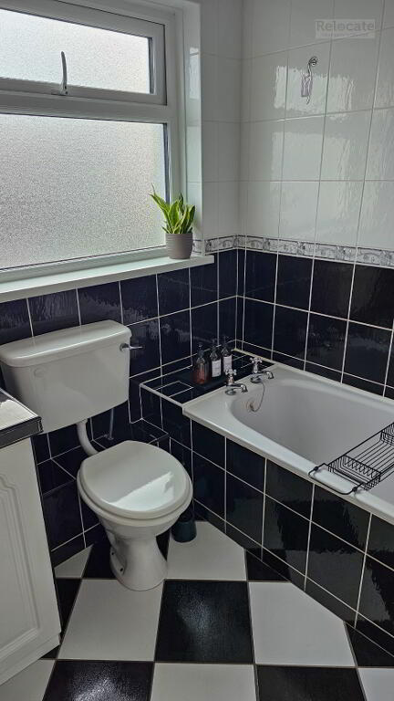 White suite comprising wash hand basin, w.c and Bath with thermostatic shower over. Fully tiled walls and floor. Privacy window to the rear.