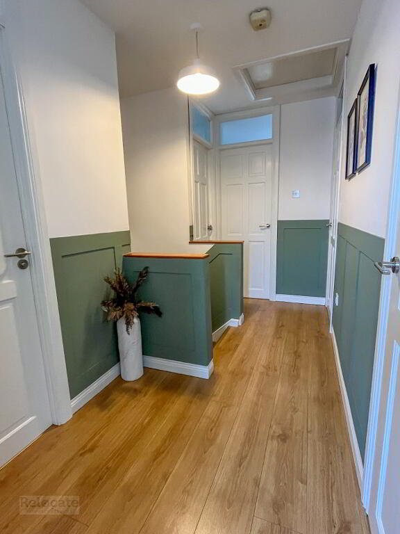 Through pvc glazed door to entrance hall. Wall paneling. Laminate wood flooring. Carpeted stairs to first floor.