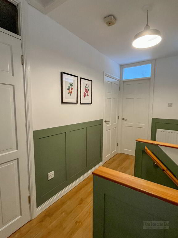 Landing with two storage cupboards. Wall paneling. Access to roofspace for storage.