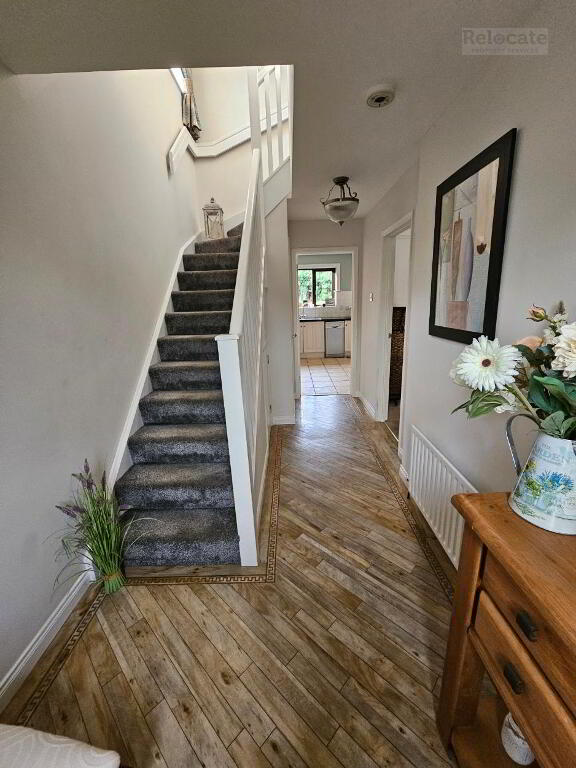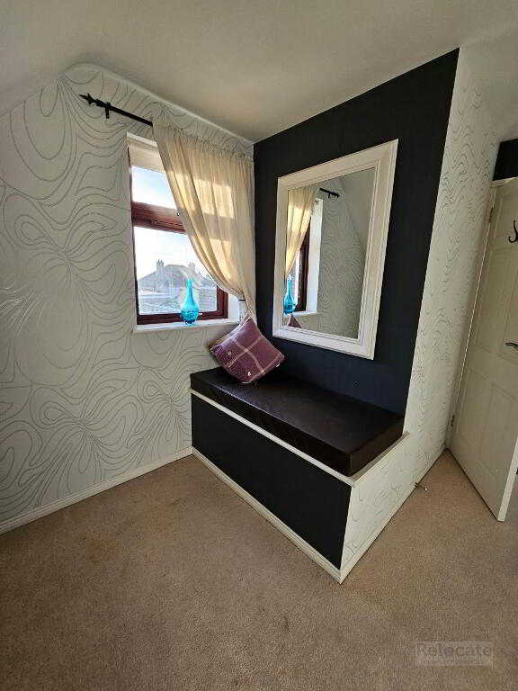 Carpeted stairs to first floor. Side window. Carpet flooring on hall landing.