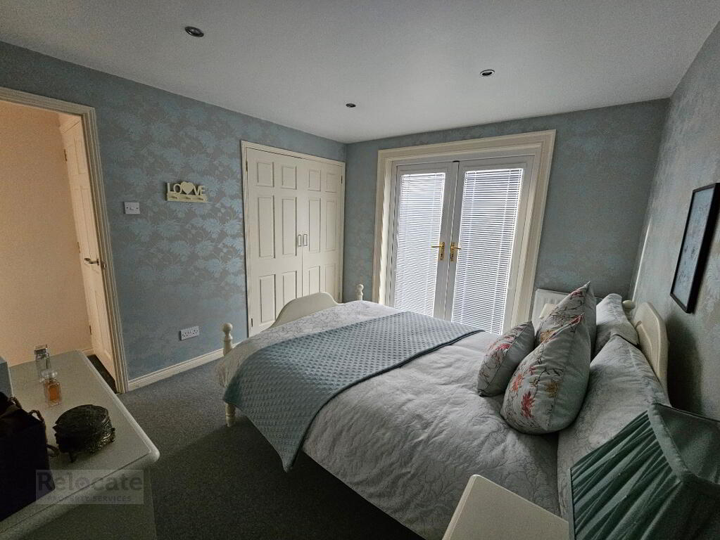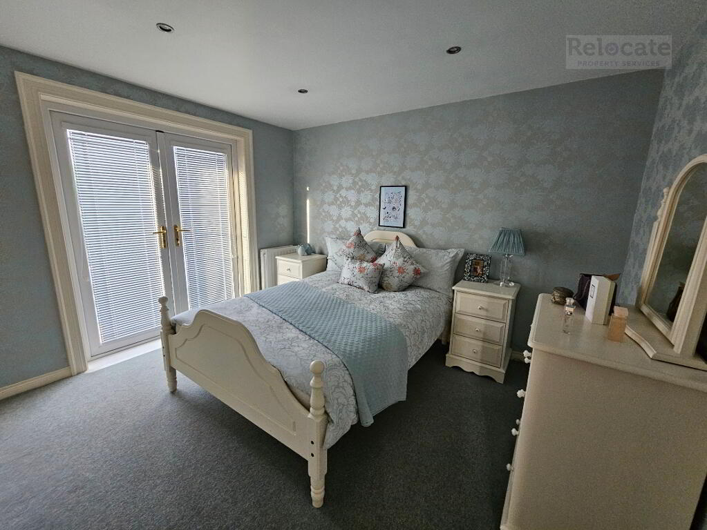 Built in wardrobes. Carpet flooring. Spot lighting. French doors to decked balcony with black rails.