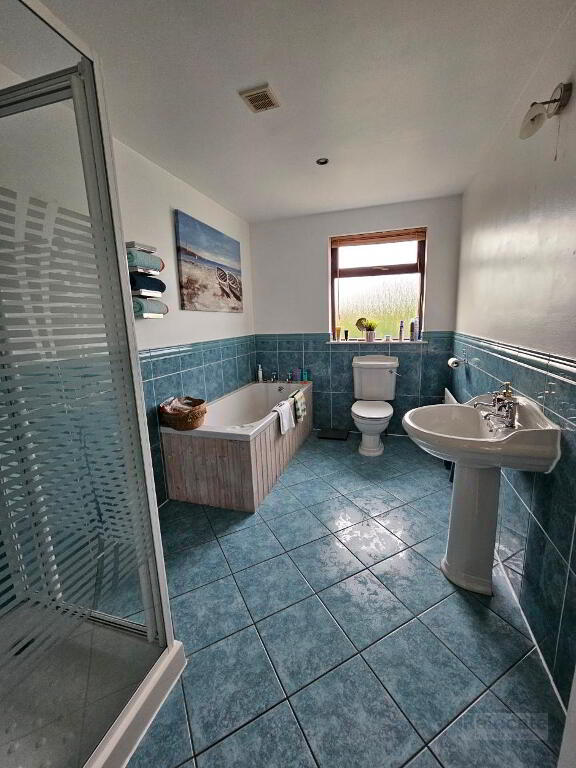 White suite with WC, wash hand basin, bath, and separate shower with electric Mira shower. Part tiled walls. Tiled flooring. Rear privacy window. Extractor fan. Spot lighting.