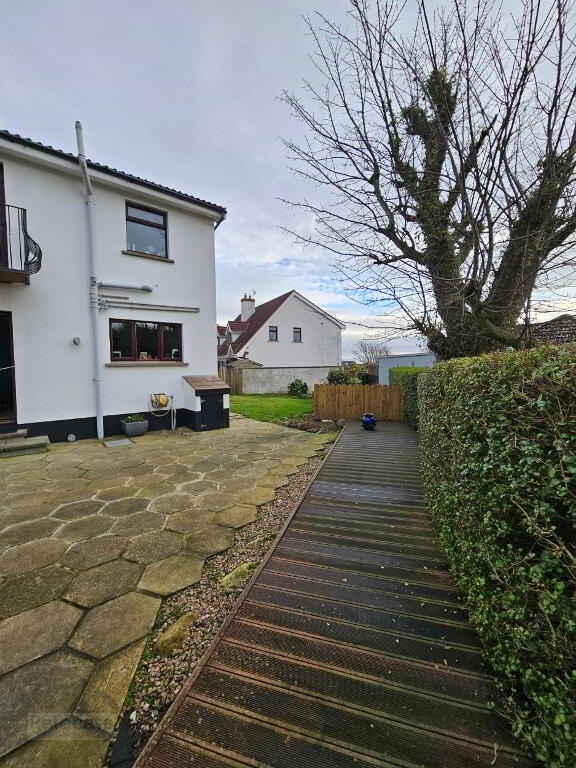 Enclosed paved rear garden with decking to bottom of garden and lawn to the side. Boundary wall to side with fencing to rest. Stoned side path with wood steps leading to front gate.