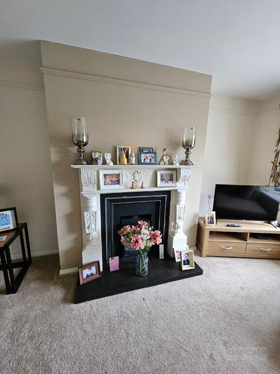 Wood burning stove with cast iron insert, tiled hearth and painted surround. Large front bay window. Carpet flooring. Picture rail.