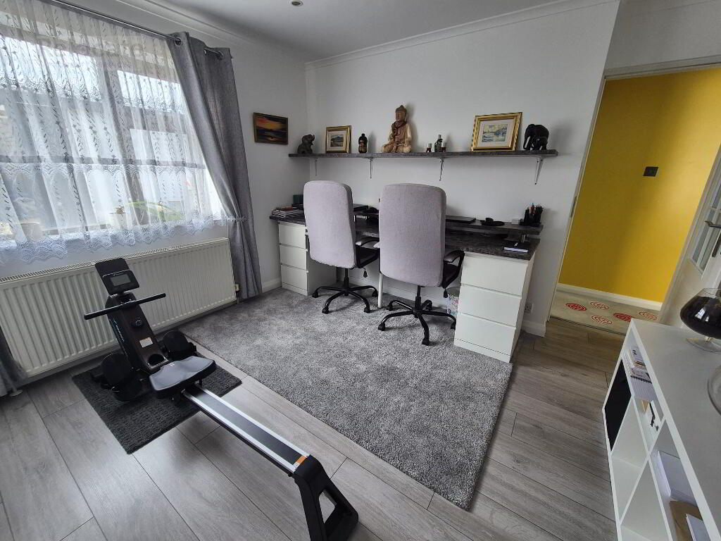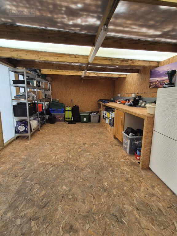 Through PVC door with side glazed panel. Privacy glazed side window to front. Grey venetian plastered walls. Vinyl flooring. Built in storage cupboards and shelving. Double power point. Rear PVC French doors leading to back garden & driveway. PVC door through to kitchen.