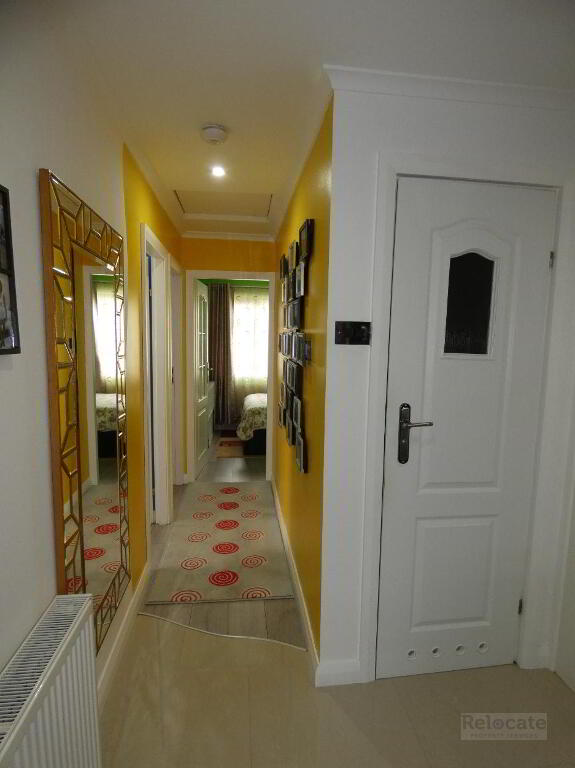 Modern fitted white high gloss kitchen with high- and low-level units. Black laminate worktops. Recess for Fridge/Freezer and microwave. Plumbed for dishwasher and washing machine. Acrylic sink and drainer with chrome hose tap. Window to front and side. 6 power points. 4 ring electric hob with stainless steel extractor fan. Integrated electric oven. Spotlights. Granite window cills. 2 radiators.