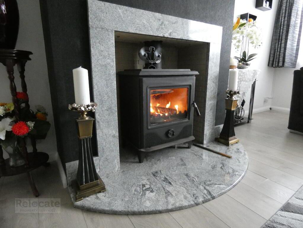 Granite hearth and fireplace surround with brick finish to inner fireplace walls. Large multi fuel stove. Feature arch opening through from kitchen with curved granite step. Large front window with granite cill. Laminate wood flooring. Spotlights.