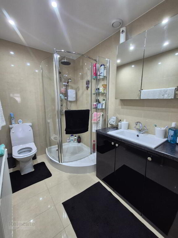 Fully tiled. Shower fitted with both electric and thermostatic shower. Built in vanity unit with wash hand basin and mirrored wall unit. Chrome fittings. Radiator.