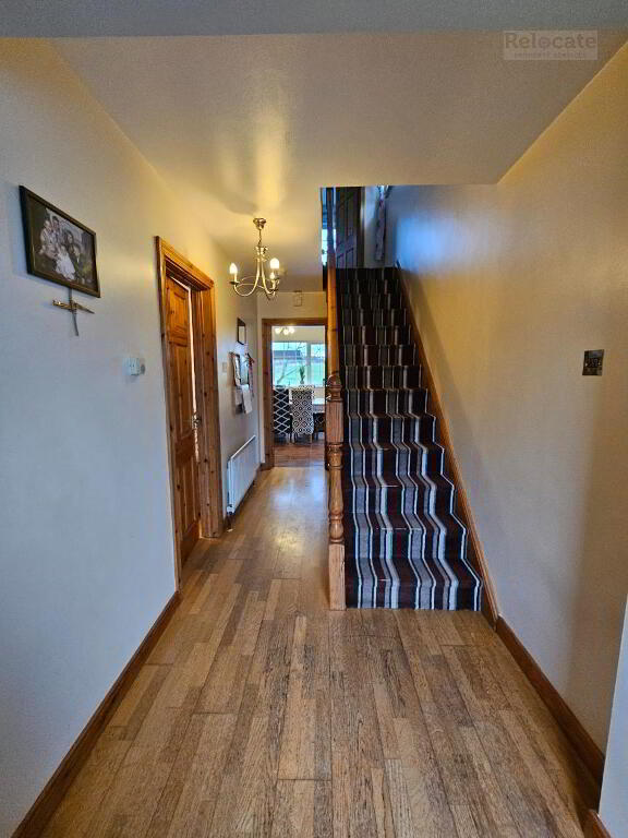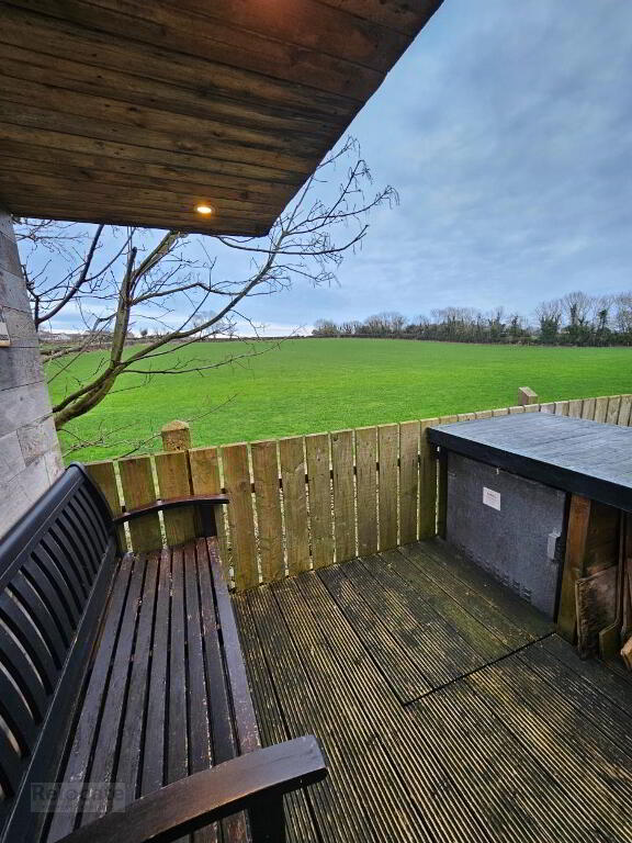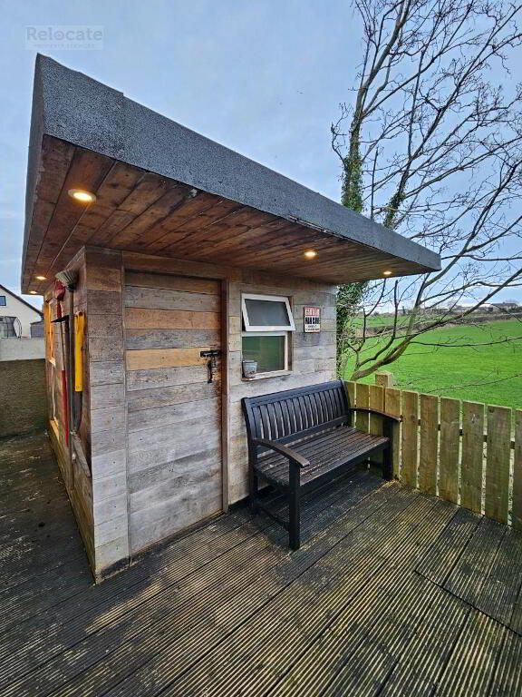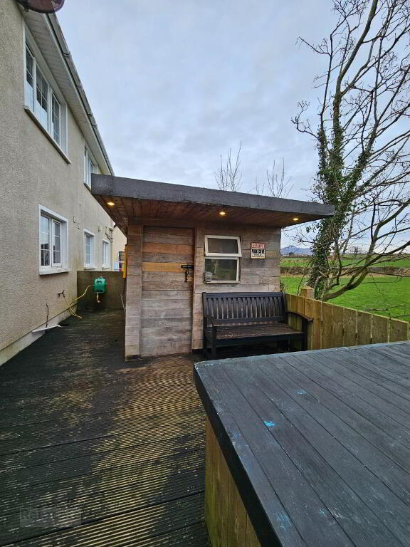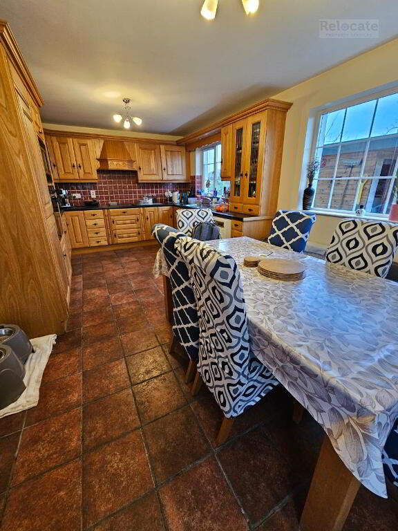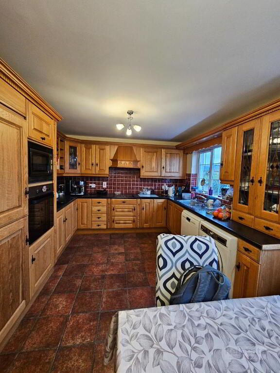 Oak fitted kitchen. Tiled splashback. Stainless steel sink & drainer. Plumbed for washing machine and dishwasher. Integrated fridge/freezer, oven and microwave. Electric hob & extractor fan over. Tiled floor. Rear window. External glazed door to rear.
